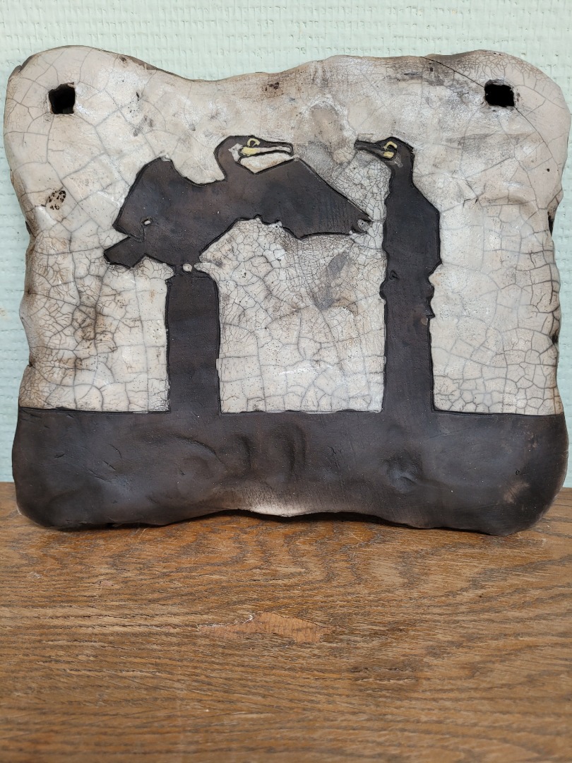 et andet tema er billedet af jomfru Maria der rider på et æsel med jesusbarnet. jeg har hentet inspiration i et næsten 1000 år gammelt relief fra en romansk kirke. På billedet ses et håndmoddeleret fad, der er brændt første gang, har fået påført oxyd og blevet afvasket, så oxyden ligger i fordybninger og streger. Senere skal det glaseres og brændes.