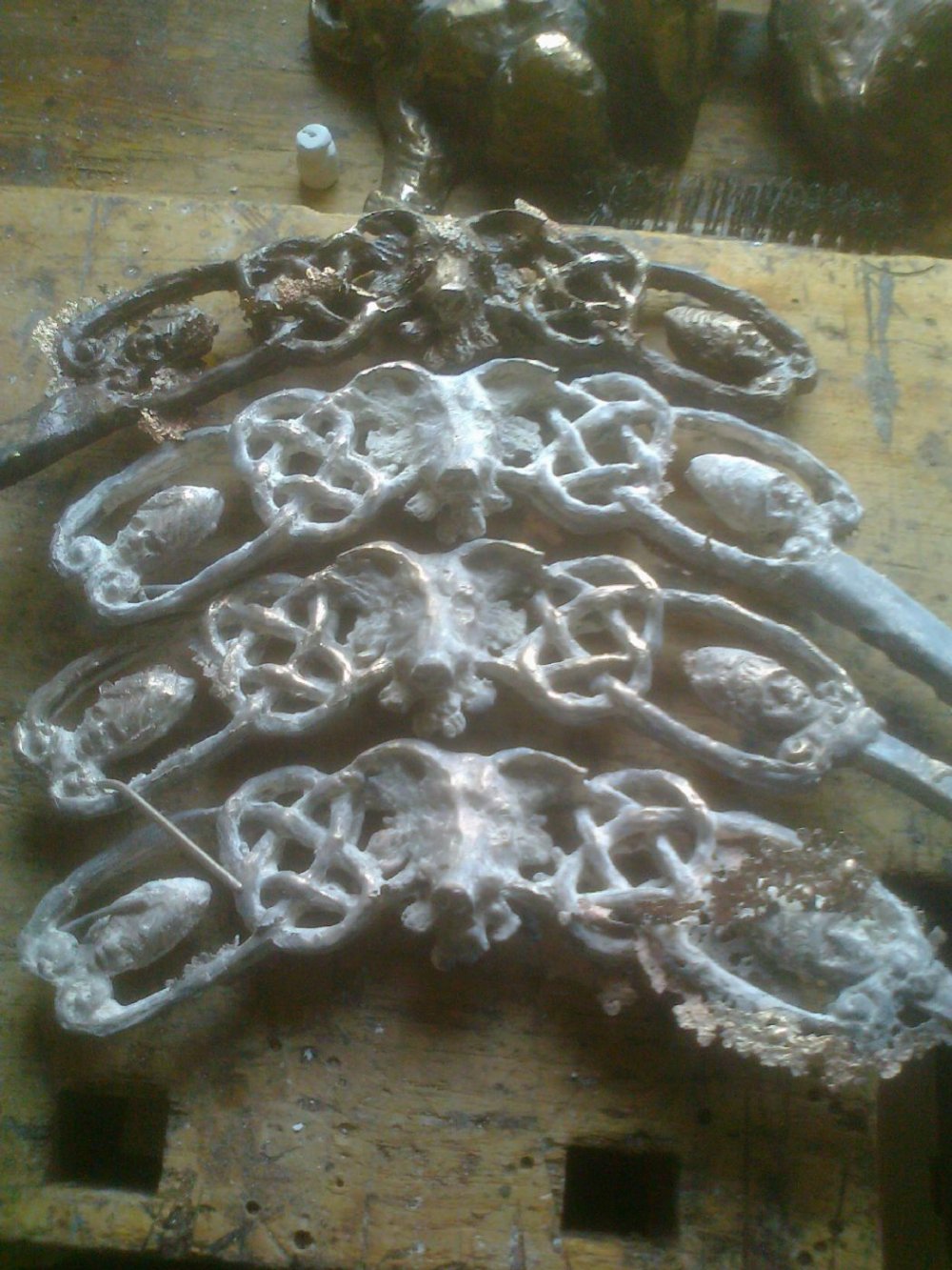 -og så er jeg igang med at lave bronzer på Hollufgård Gæsteatelier i Odense. På billedet er to skulpturer af pap og voks blevet udstyret med kanaler og støbekop. derefter skal de støbes ind i en blanding af tegl og gips. De bliver brændt ud og senere bliver den flydende bronze hældt ind i formen.
